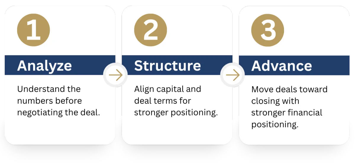 From valuations to acquisition support and financing coordination, our role is to make sure the financial side of a deal is clear, credible, and positioned to close.